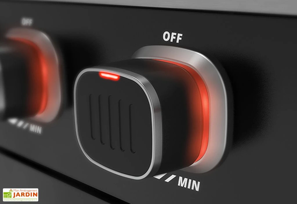 Ce barbecue au gaz possède un couvercle à double paroi avec thermomètre intégré. Ce couvercle dissimule trois brûleurs réglables en inox (9,9 kW) et un brûleur latéral en fonte (3,3 kW). Chacun de ces brûleurs dispose d’un bouton rétroéclairé permettant d’ajuster la puissance avec précision, pour des cuissons parfaitement maîtrisées. Ce barbecue est équipé d’une plaque en fonte émaillée et d’une grille en inox offrant une surface de cuisson de 60 x 42 cm pour réaliser vos grillades.