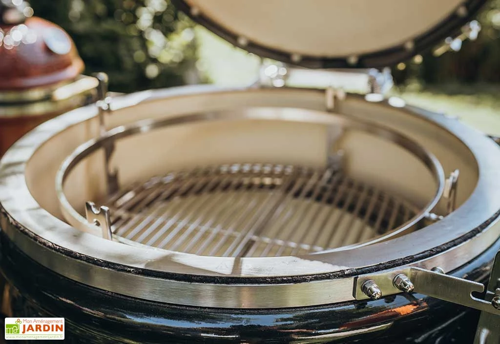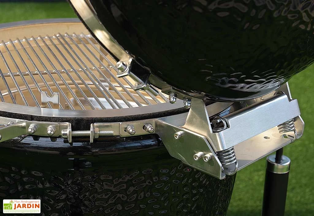 Très bien pensé, ce kamado est équipé d’un système de cuisson à trois étages composé de deux demi-grilles et d’autant de demi pierres déflectrices et de demi-lèchefrites, ce qui vous permet d’organiser votre installation selon que vous souhaitiez une cuisson directe ou indirecte de vos aliments. Une grille ronde de 44 cm de diamètre est également incluse. Notez que ces différentes grilles de cuisson sont conçues en inox. Elles se montreront donc insensibles à la corrosion et pourront être entretenues facilement.