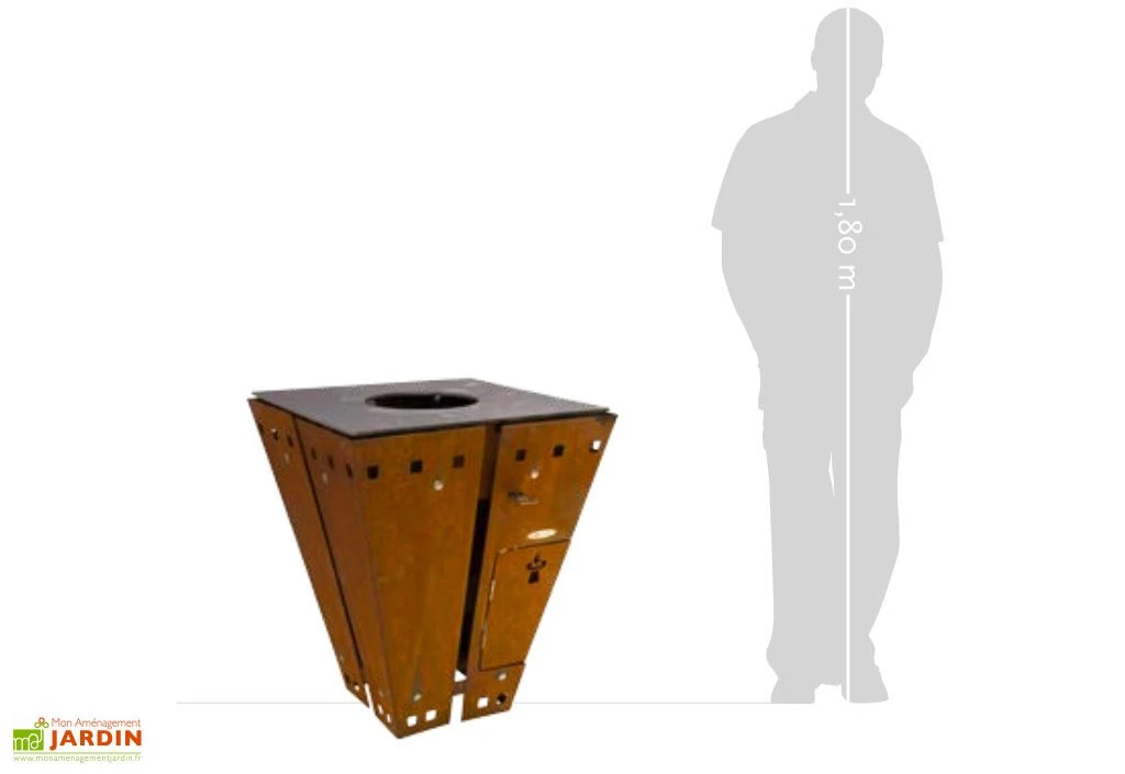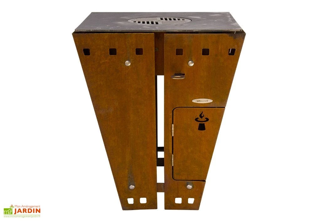 Le corps en acier du braséro est volontairement oxydé afin d’offrir un design ancien. L’oxydation n’altère pas la solidité de l’ensemble. Le corps dispose d’une double paroi, ce qui lui permet de ne jamais être brûlant même lorsqu’il est utilisé à pleine puissance.