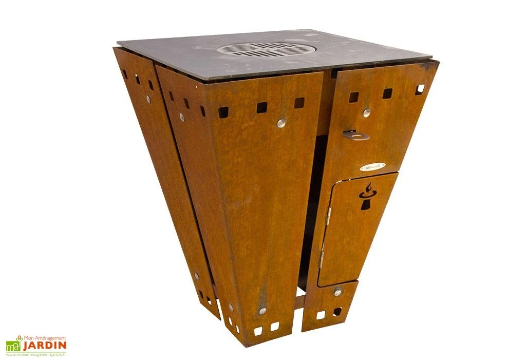 Le braséro, original grâce à sa forme pyramidale, est simple à utiliser. Le tirage se règle manuellement. La garantie est de 10 ans pour la plaque de cuisson et de 2 ans sur le reste du braséro.