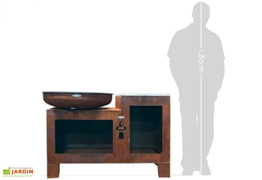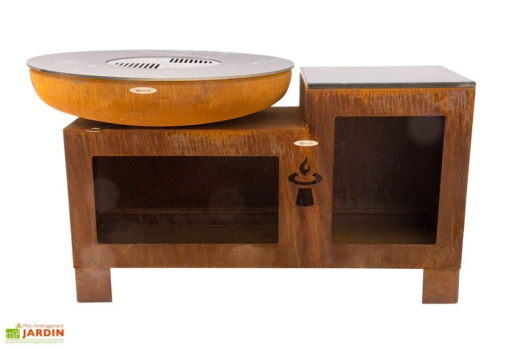 Le braséro Vulcano L de Remuni est monté sur une table de travail afin de vous offrir l’expérience d’une petite cuisine extérieure. Il est fabriqué de façon artisanale et assemblé en Allemagne. L’acier est volontairement oxydé pour un design vintage, sans altérer la solidité du braséro et de sa table.