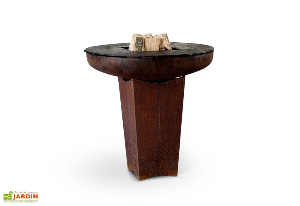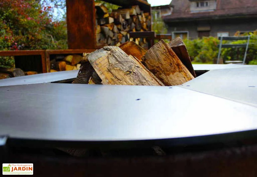 Ce brasero se compose donc d’une cuve en acier de 3 mm d’épaisseur et d’une plaque de cuisson en acier au carbone laminé de 8 mm d’épaisseur, pour une bonne conductivité thermique. La plaque, comme la cuve, affiche un diamètre de 100 cm et une fois installé, le tout culminera à 103 cm de hauteur.