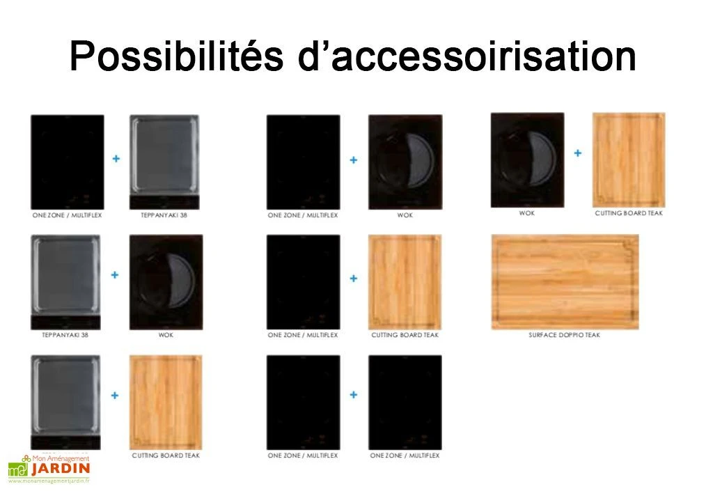 Le chariot se transforme en cuisine d’extérieur grâce à l’installation de 2 plaques de cuisson et accessoires suivants :