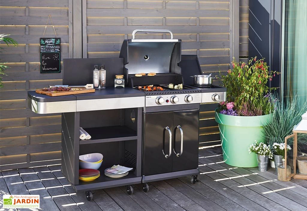 La cuisine d’extérieur de Cook’in Garden est composée d’un barbecue à gaz et d’une desserte. Elle mesure 182 x 57 x 112 cm et pèse 51 kg. Sa structure est en métal et elle est facile à ranger grâce à ses 8 roues. Elle bénéficie d’une surface de préparation, d’un réchaud latéral et d’un espace de stockage fermé.