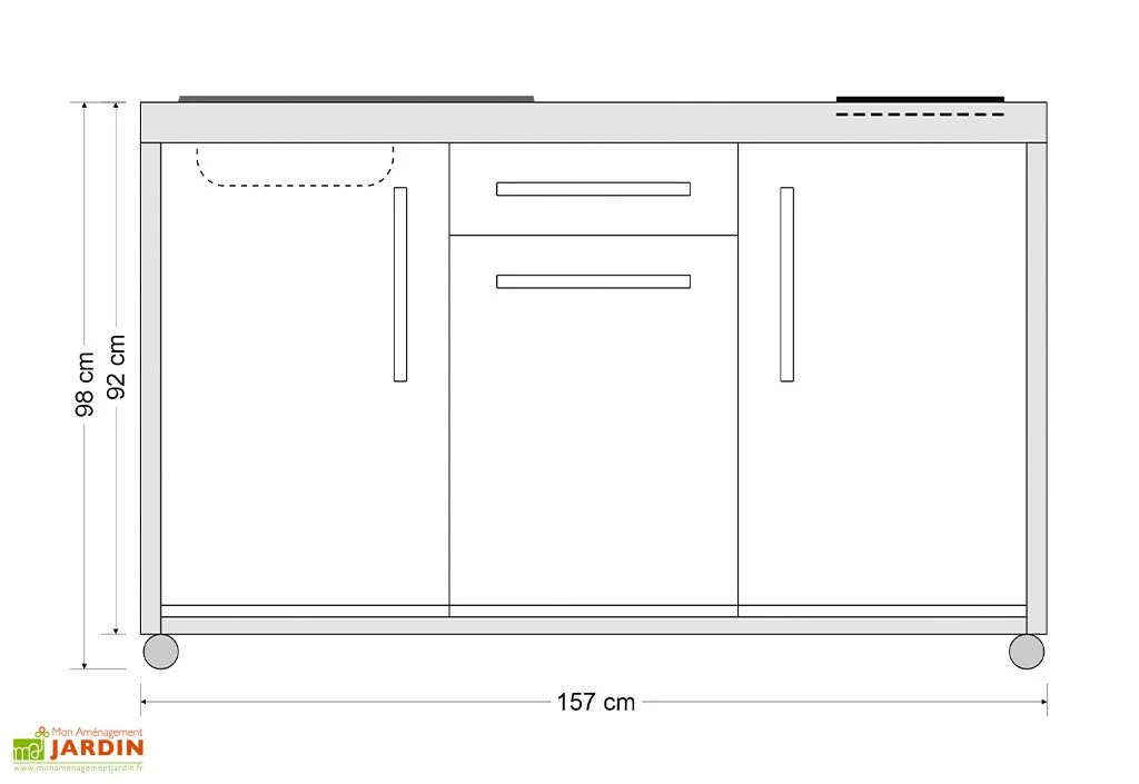Cette kitchenette tout équipée de chez Stengel est spécialement conçue pour la vie à l’extérieur. Elle mesure 157 cm de longueur, 62 cm de profondeur et 98 cm de hauteur. Montée sur roulettes elle est facile à déplacer, idéale pour la terrasse.