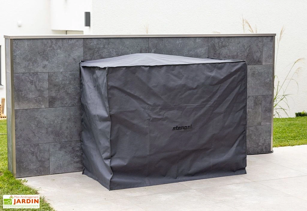 La cuisine extérieure Stengel est fabriquée en Allemagne dans des matériaux insensibles aux conditions climatiques. Son plan de travail en acier inoxydable et ses parois en métal thermolaqué ne craignent pas la corrosion. Une housse étanche est incluse pour apporter une protection supplémentaire. Cette couverture hydrofuge est conçue en tissu robuste gris.