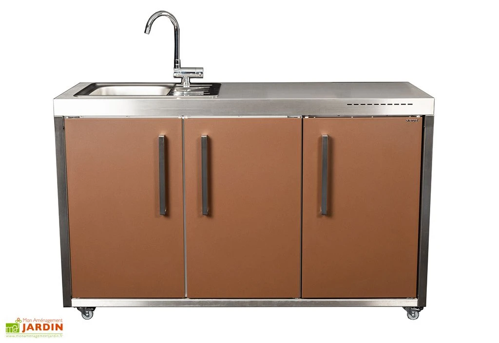 La cuisine extérieure est fabriquée en acier inoxydable pour l’évier et le plan de travail. Les façades pleines en métal à double parois isolées sont quant à elles thermolaquées. L’acier inoxydable et le thermolaquage apportent une excellente protection contre la corrosion et ne demandent aucun entretien.