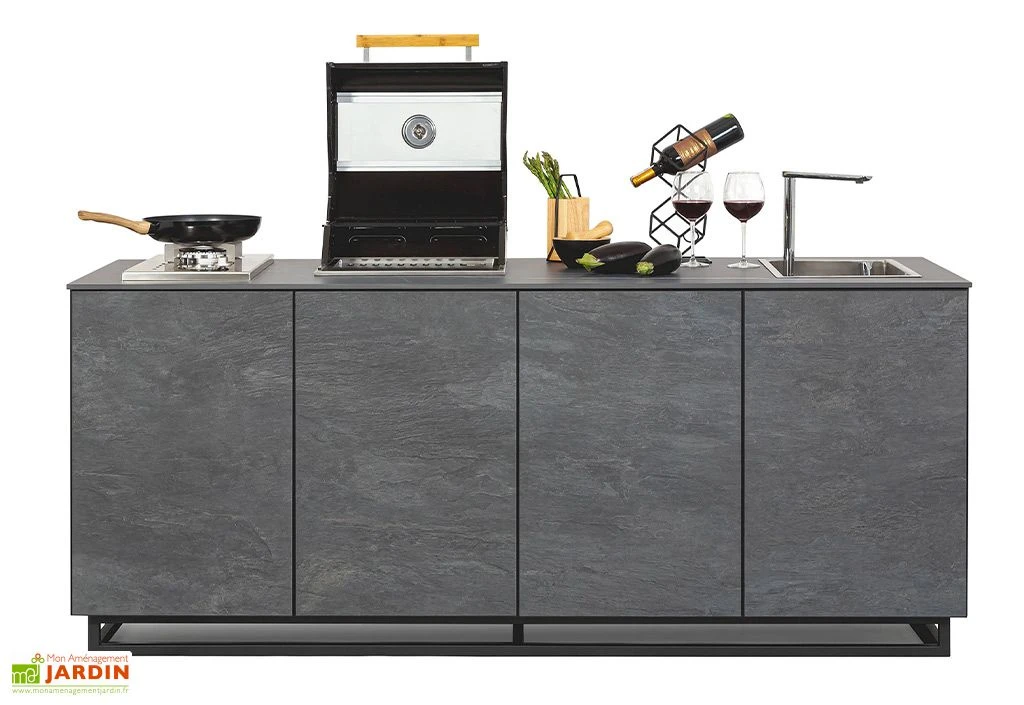 Cette cuisine extérieure à 4 modules GREY fait partie de la gamme CANA Style de chez CANA Concept. Elle mesure 201 x 75 cm (longueur, largeur) sur une hauteur de 85 cm. Son design élégant et ses tons foncés et sobres feront leur petit effet lors de vos réceptions. Cette cuisine d’extérieur est dédiée aux professionnels de l’hôtellerie-restauration ainsi qu’aux cafés et aux traiteurs. Elle vous permettra d’organiser des cours de cuisine en plein air ainsi que des événements et des prestations de « live-cooking » très à la mode ces dernières années.