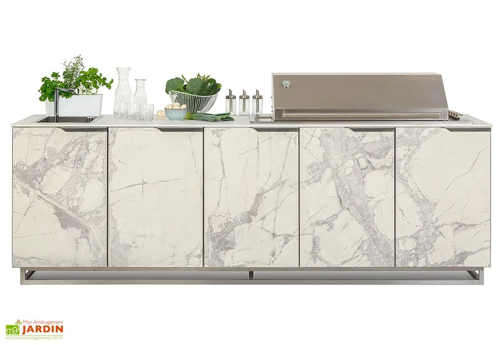 Cette cuisine d’extérieur a été fabriquée à partir de matériaux de haute qualité pour lui assurer une forte résistance face aux intempéries et une grande durabilité dans le temps. Elle repose donc sur une structure en acier inoxydable solide et résistante face à la corrosion. Vous profiterez également d’un casier pour ranger votre bouteille de gaz ainsi qu’un autre casier de rangement, tous les deux en contreplaqué de yacht. Ce matériau est utilisé dans la fabrication de bateaux, votre cuisine fera donc preuve d’une grande solidité et d’une parfaite étanchéité.