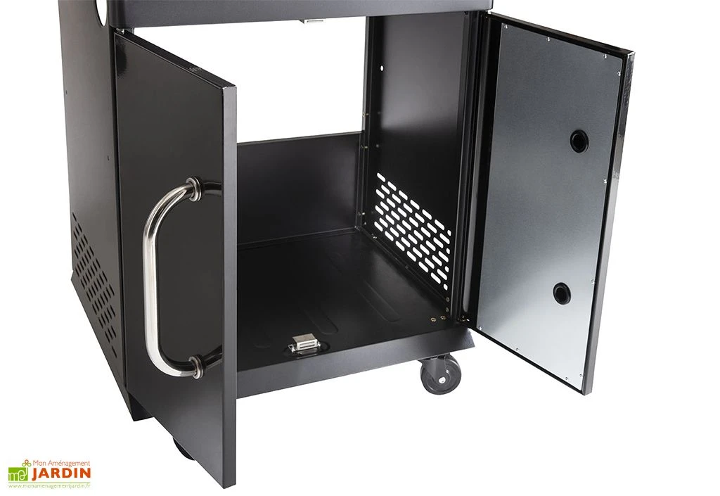 L’évier en inox dispose d’une structure en métal comprenant un espace de rangement inférieur avec portes afin d’y entreposer votre vaisselle ou des produits d’entretien par exemple. Des roues sont installées pour déplacer l’accessoire pour barbecue facilement, et des freins intégrés dessus permettent de l’immobiliser.