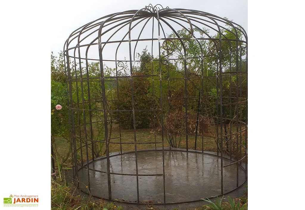 La tonnelle en fer forgé est composée de tiges carrées de 14 mm et ses décors de tiges carrées de 8 mm. Ses 3,00 m de diamètre, sa hauteur totale de 2,90 m ainsi que ses deux grandes arches de 2,10 x 1,10 m vous permettront d’accéder et d’aménager aisément l’intérieur de la structure.