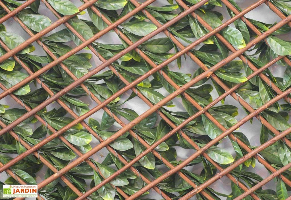 Le treillis extensible est composé d’une structure en bois de saule rigide. Les feuilles sont en polyéthylène, disposées sur l’une des faces du treillis. On en compte environ 1000 pour un panneau de 200 x 100 cm. Le panneau possède une épaisseur de 35 mm. Vous pouvez ainsi vous en servir comme brise-vue ou comme décoration extérieure ou intérieure pour dissimuler un mur par exemple.