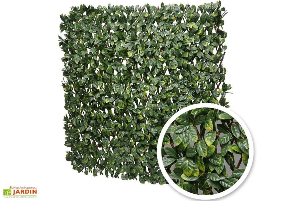 Le feuillage artificiel de laurier de chez France Green est installé sur un treillis extensible. Il mesure 200 cm de longueur et 100 cm de hauteur en position classique mais vous pouvez l’agrandir ou le réduire dans la limite de 140 x 40 cm (dimensions minimales) et de 260 x 80 cm (dimensions maximales). Vous pouvez ainsi l’adapter à vos besoins. Le treillis existe également en version 300 x 100 cm : longueur minimale de 60 cm et une longueur maximale de 370 cm