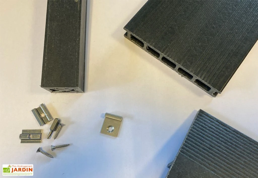 Fabriqué par Just’Aposé, le kit de lames de terrasse de la gamme Lisa permet de couvrir une surface maximale de 20 m². Il est composé de 58 lames rainurées, 19 lambourdes, 5 profils de finition et de clips ainsi que de la visserie en inox pour assurer la bonne fixation de l’ensemble. Deux coloris sont disponibles : gris et anthracite.