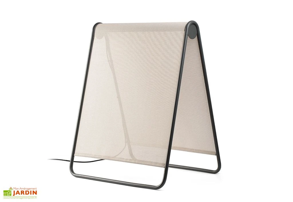 Ce luminaire de jardin au design original vous permettra de profiter d’une source de lumière douce pour vos soirées en extérieur. Il est disponible dans deux coloris au choix, beige ou bleu, et intègre un éclairage LED de 18 W. Son abat-jour en polycarbonate se situe entre deux pans de textilène, le tout étant maintenu par une solide structure en aluminium, totalement insensible à la rouille.