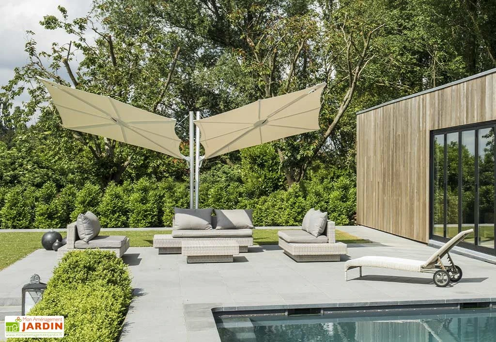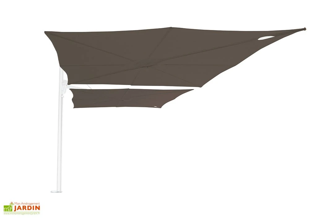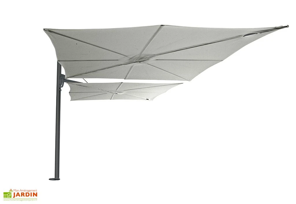 Le parasol Spectra Duo fabriqué par Umbrosa en Belgique est équipé de 2 grandes toiles carrées de 250 cm de côté.