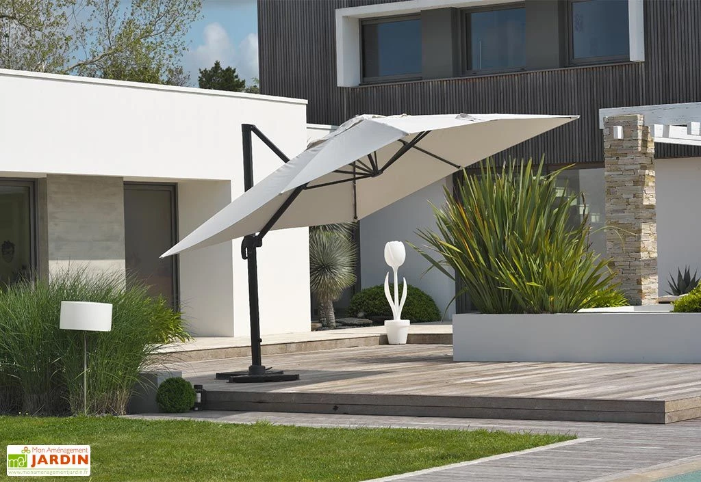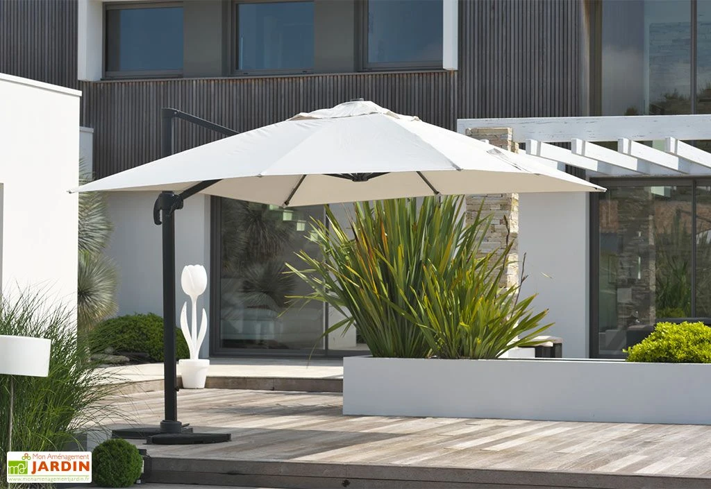 Le parasol de chez DCB Garden dispose d’une armature en aluminium et d’une toile en polyester. La toile mesure 4 m de longueur et 3 m de largeur. Elle est imperméabilisée et dispose d’une épaisseur de 230 gr/m2. Le parasol gris est déporté pour créer une ombre importante. Le pied en acier est rotatif ce qui vous permet de l’orienter facilement dans la direction voulue. La garantie est de 2 ans.