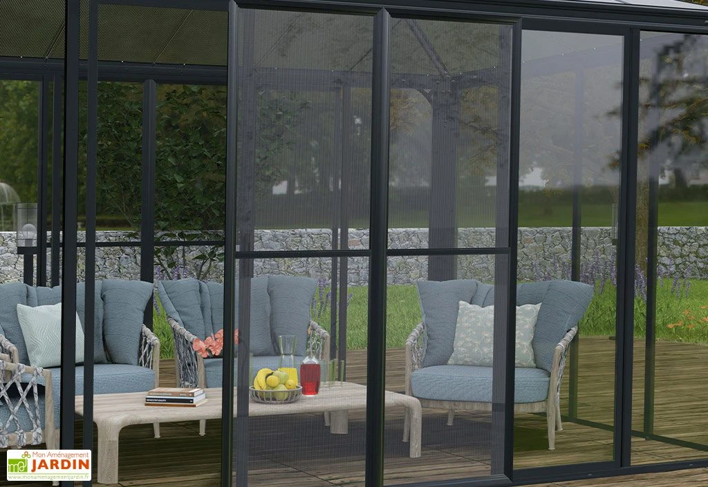 La double porte est constituée d’un cadre en aluminium poudré gris anthracite et la moustiquaire est en polyester. Au même titre que le jardin d’hiver, elle ne vous demandera aucun entretien. Elle mesure 205 cm de hauteur et 137 cm de largeur.