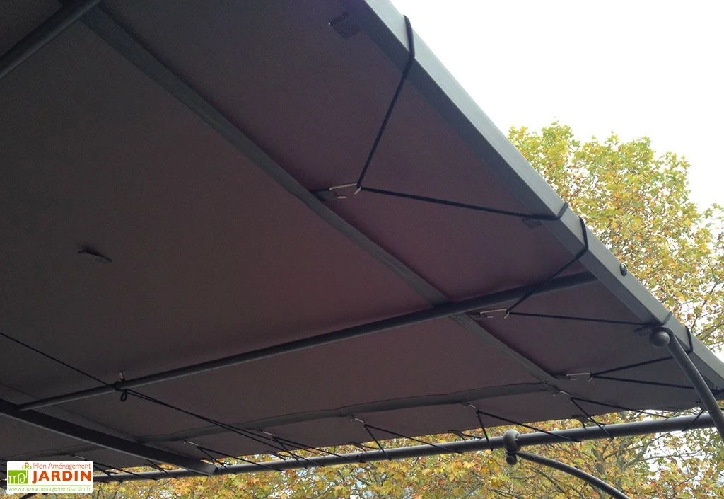La toile de remplacement est fournie avec un système d’attaches universelles (sandow et crochets). Elle s’adapte sur les tonnelles de 3 x 3 m, adossée, avec une seule pente. Il est à noter qu’un retrait de quelques cm est appliqué sur tout le périmètre de la toile. Cet espace permet de caler le sandow et de tendre la toile.