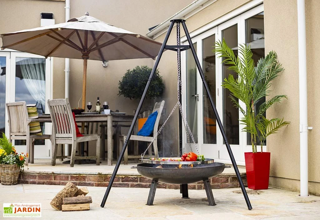 Le trépied mesure 128 cm de longueur et 108 cm de largeur. Il est en acier recouvert d’une peinture noire résistant à de hautes températures.